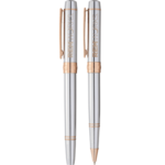 Exclusive Cutter & Buck® design. This set features shiny chrome upper and bottom barrel with gold accents. Subtle branding. Includes premium black ink cartridges. Includes 2-piece Cutter & Buck® gift box.