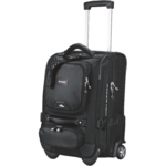 Lightweight internal structure and large hinged opening to main compartment. Two large exterior pockets. Two large zippered mesh packing pockets. Inline skate wheels and recessed, locking telescoping handle. Adjustable tow strap to attach additional bags. Meets FAA carry-on regulations.