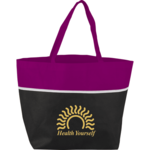 The Deluxe YaYa Tote has an open main compartment and an open front pocket with a Velcro closure and double 22 inch handles. Bag width is measured at top which is flared. Bottom width is 12".