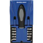 Set includes ten screwdriver bits, screwdriver handle and a pop up stand that conveniently stores all of the pieces in one place.