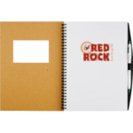 Die-cut window in cover reveals full-color, heavy, coated insert page. 70 sheets of spiral-bound lined paper. Built-in elastic pen loop. Elastic closure. Important contacts page and calendar. Pen is not included.