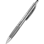 Metallic finish barrel, shiny chrome accents and soft rubber grip. Retractable click action mechanism and stylus. Black ballpoint ink cartridge and tungsten carbide tip.