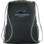 Large main compartment with cinch top closure. Drawstring design for over-the-shoulder or backpack carry. Side mesh pockets.