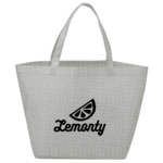 The Crossweave Non-Woven Shopper Tote features a large open main compartment and a trendy, metallic crosshatch weave look.