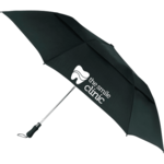 The 55" Vented Auto Open Folding Golf Umbrella features an automatic opening and a metal shaft with partial fiberglass ribs for added durability, and a windproof vented canopy design. It also has a color matching comfortable foam handle and carry pouch. Folds to 22" when closed. Available for one-day turn.